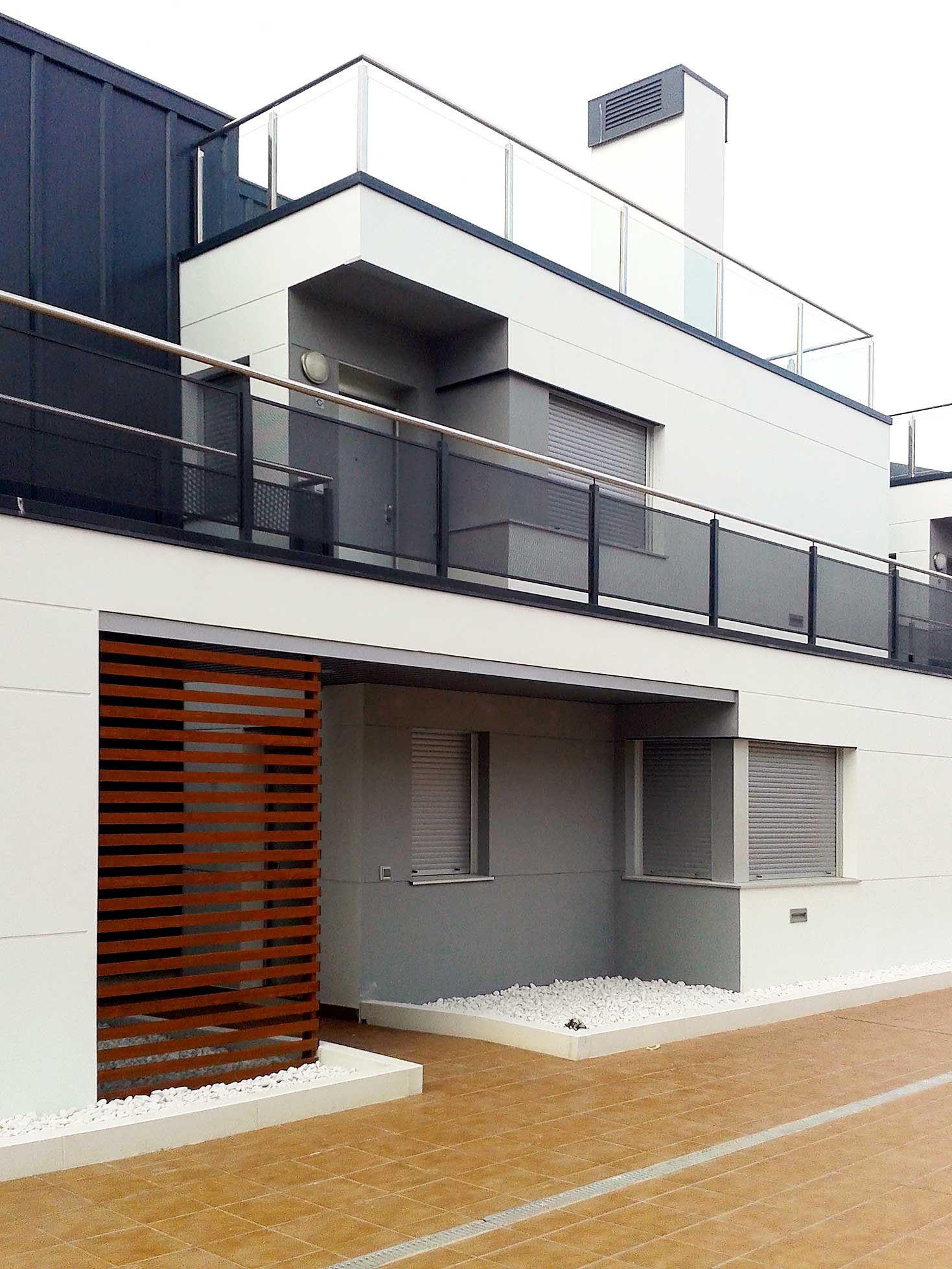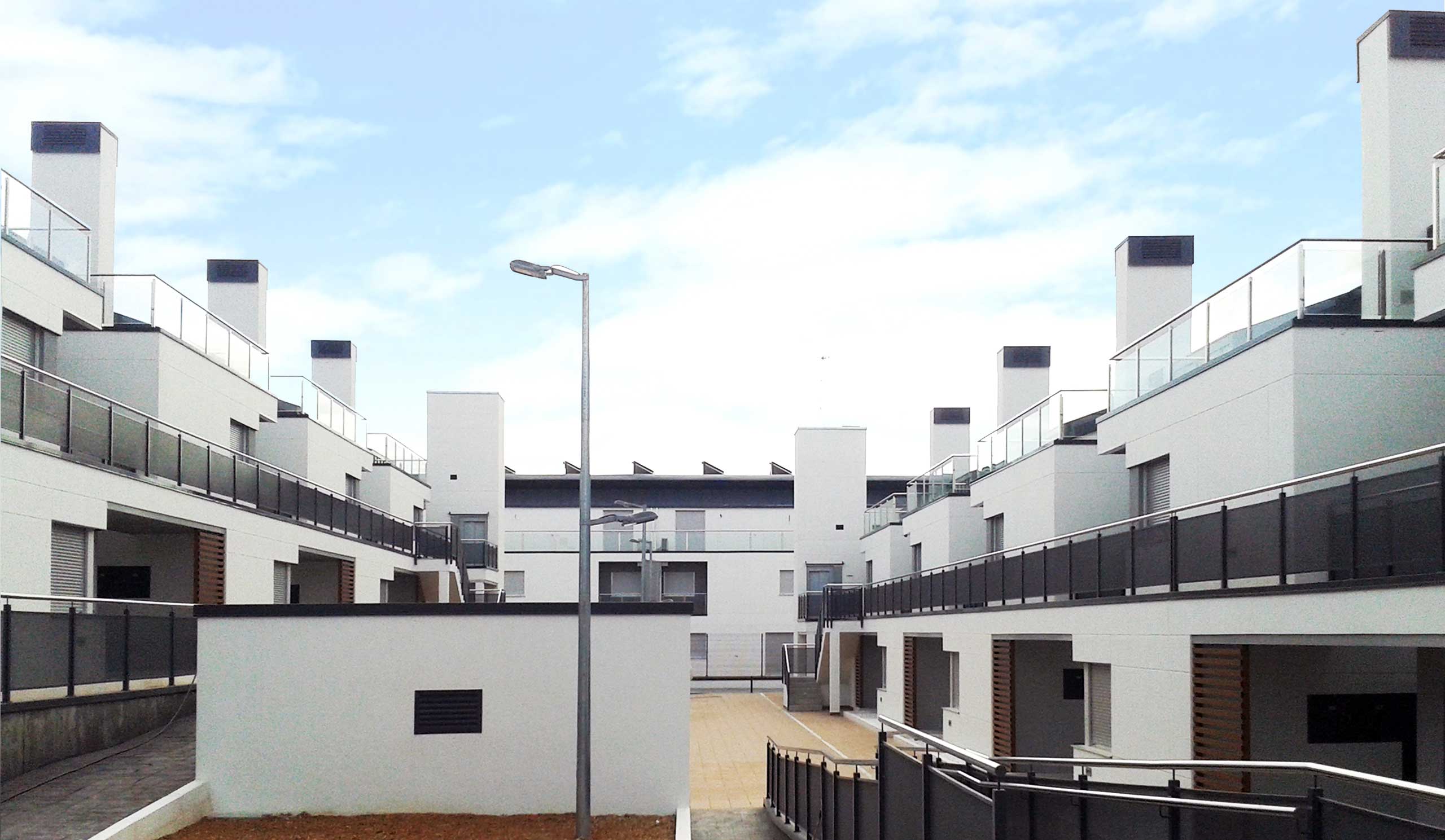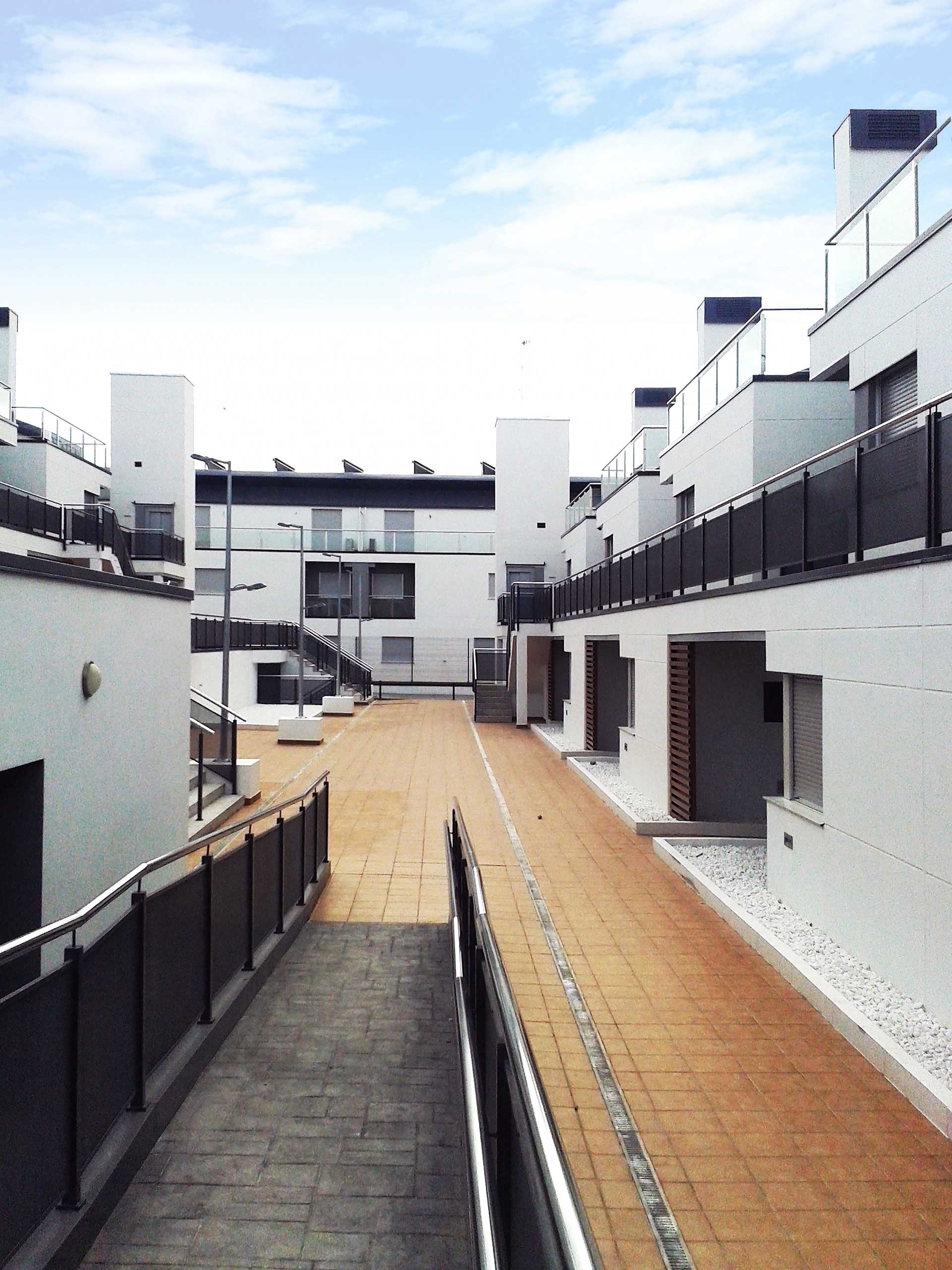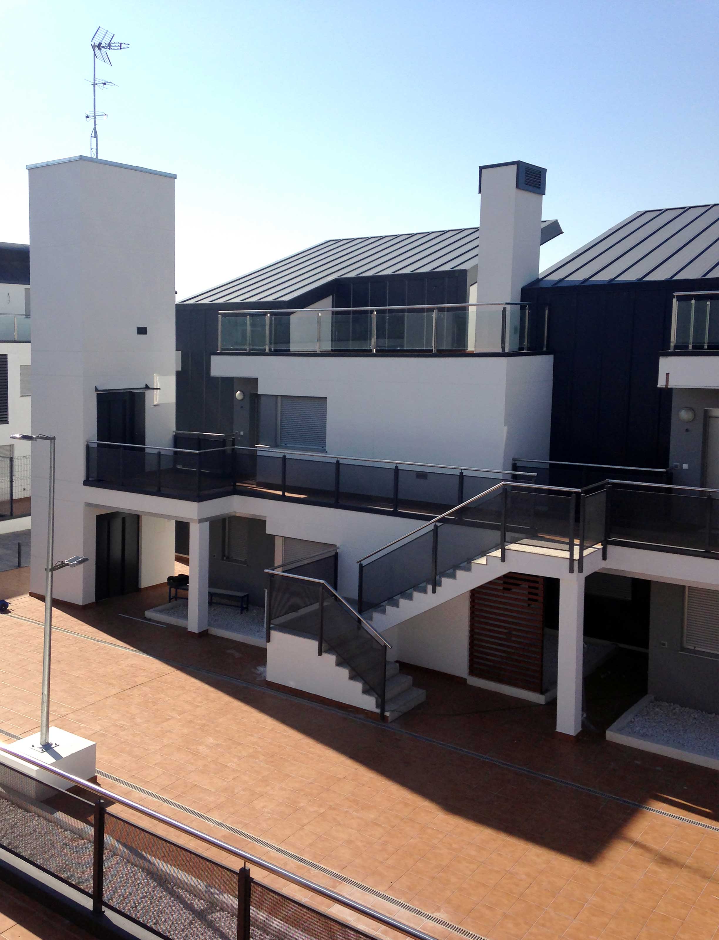Los bloques A y B están concebidos como viviendas en galería con dos plantas más bajo cubierta. Se proyectan unas viviendas en planta baja con jardín exterior mientras que en planta primera se proyectan viviendas dúplex con terrazas en ático, es decir, trasladamos los espacios exteriores de planta baja a los áticos de las viviendas de planta superior. Exteriormente se huye de las imágenes de residencial colectivo para crear un edificio ambiguo que enlaza más con una idea de unifamiliar de baja densidad. Esta ambigüedad formal y programática buscada, viene acentuada también en la utilización de los materiales, donde las cubiertas de chapa plegada descienden por la fachada convirtiéndose en cerramiento vertical y difuminando las funciones del material.