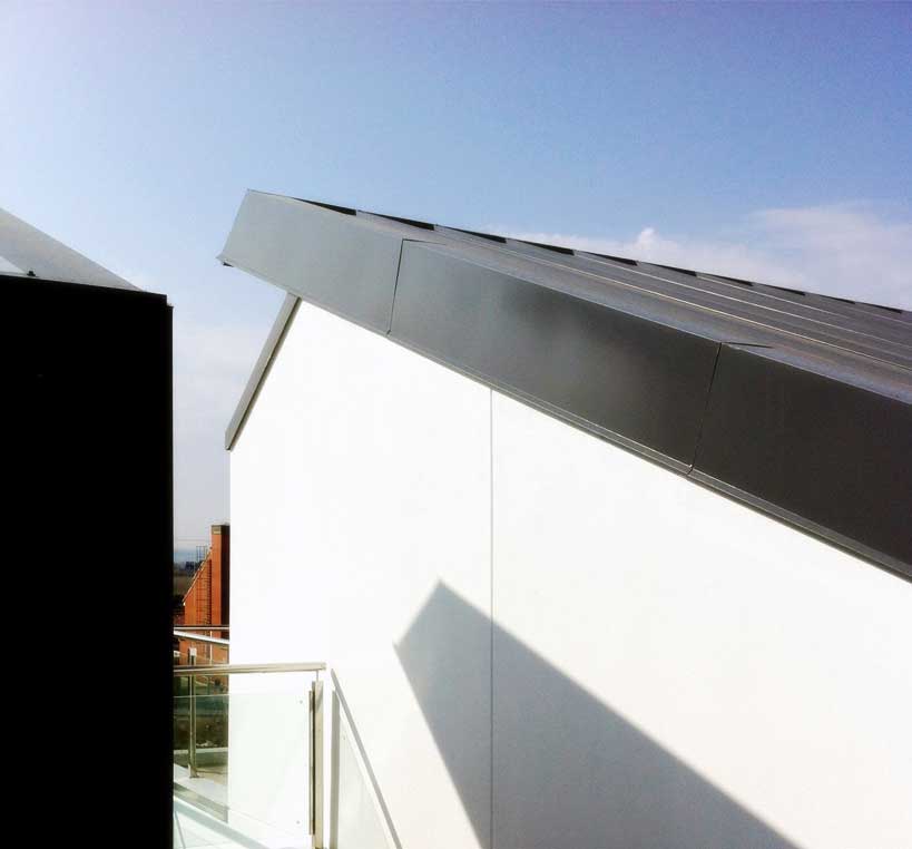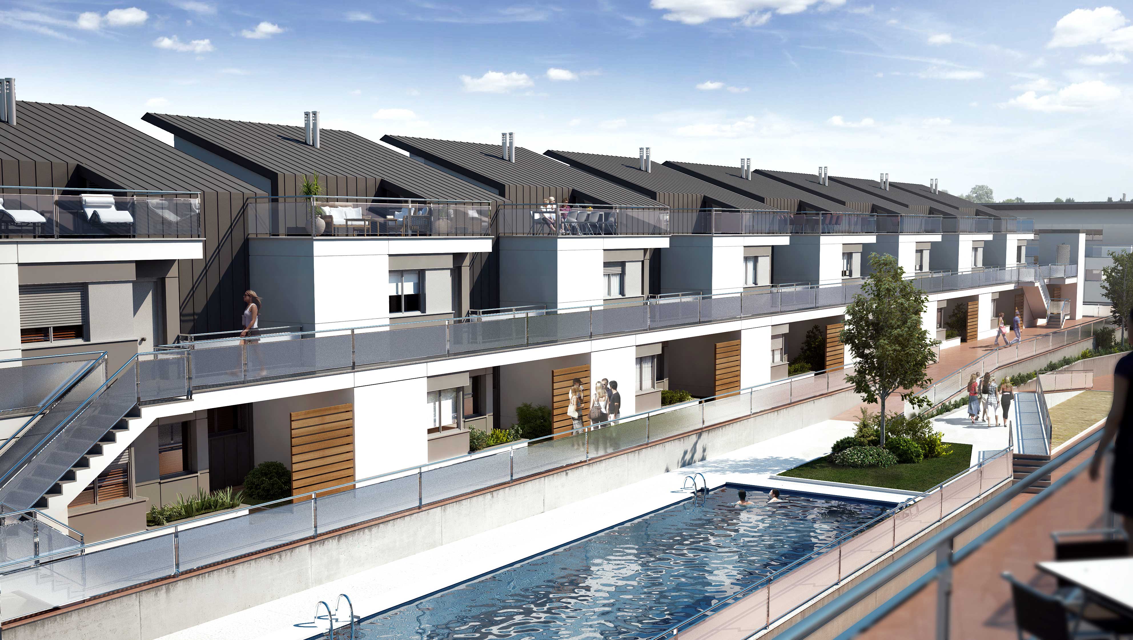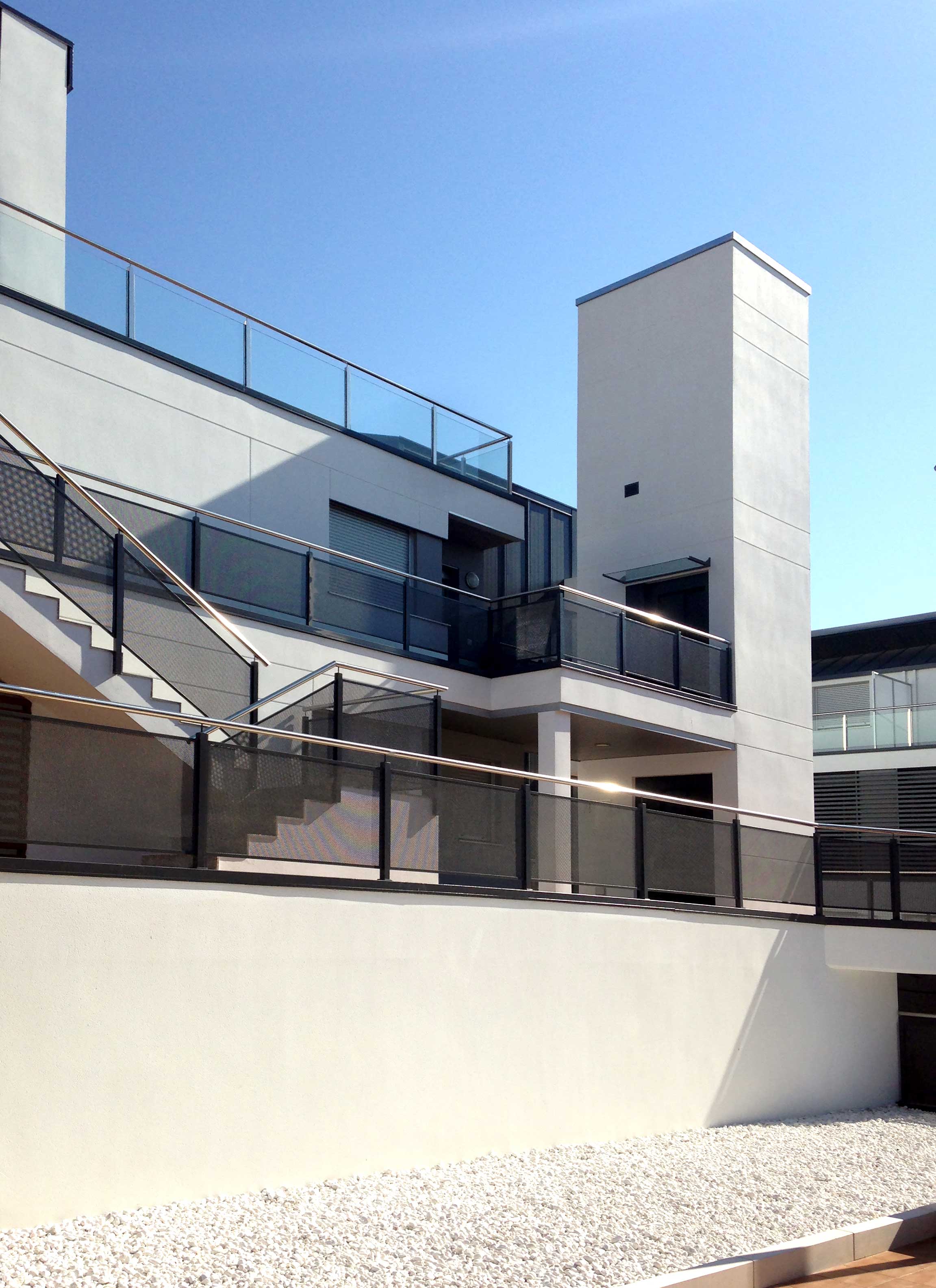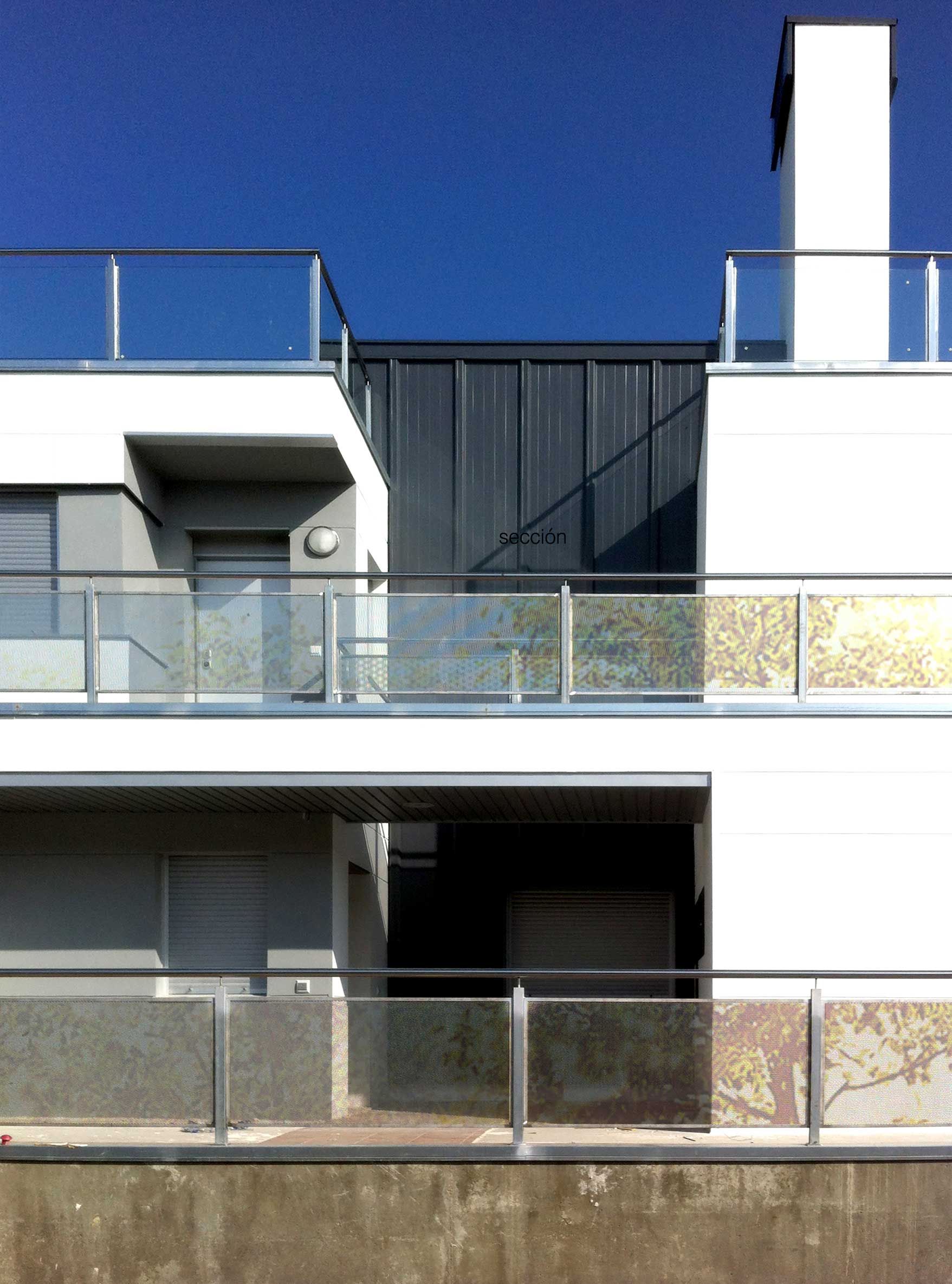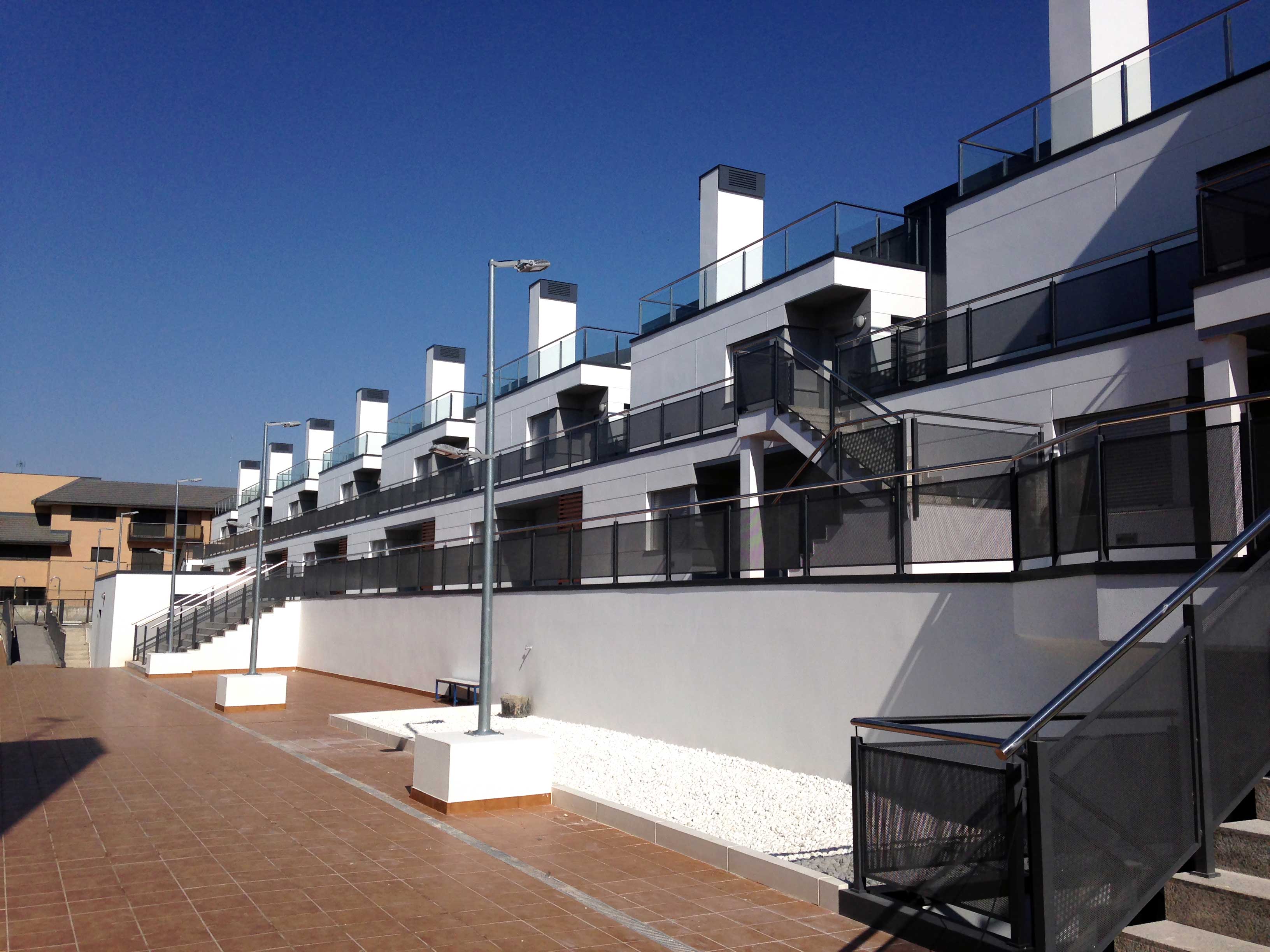 Los bloques A y B están concebidos como viviendas en galería con dos plantas más bajo cubierta. Se proyectan unas viviendas en planta baja con jardín exterior mientras que en planta primera se proyectan viviendas dúplex con terrazas en ático, es decir, trasladamos los espacios exteriores de planta baja a los áticos de las viviendas de planta superior. Exteriormente se huye de las imágenes de residencial colectivo para crear un edificio ambiguo que enlaza más con una idea de unifamiliar de baja densidad. Esta ambigüedad formal y programática buscada, viene acentuada también en la utilización de los materiales, donde las cubiertas de chapa plegada descienden por la fachada convirtiéndose en cerramiento vertical y difuminando las funciones del material.