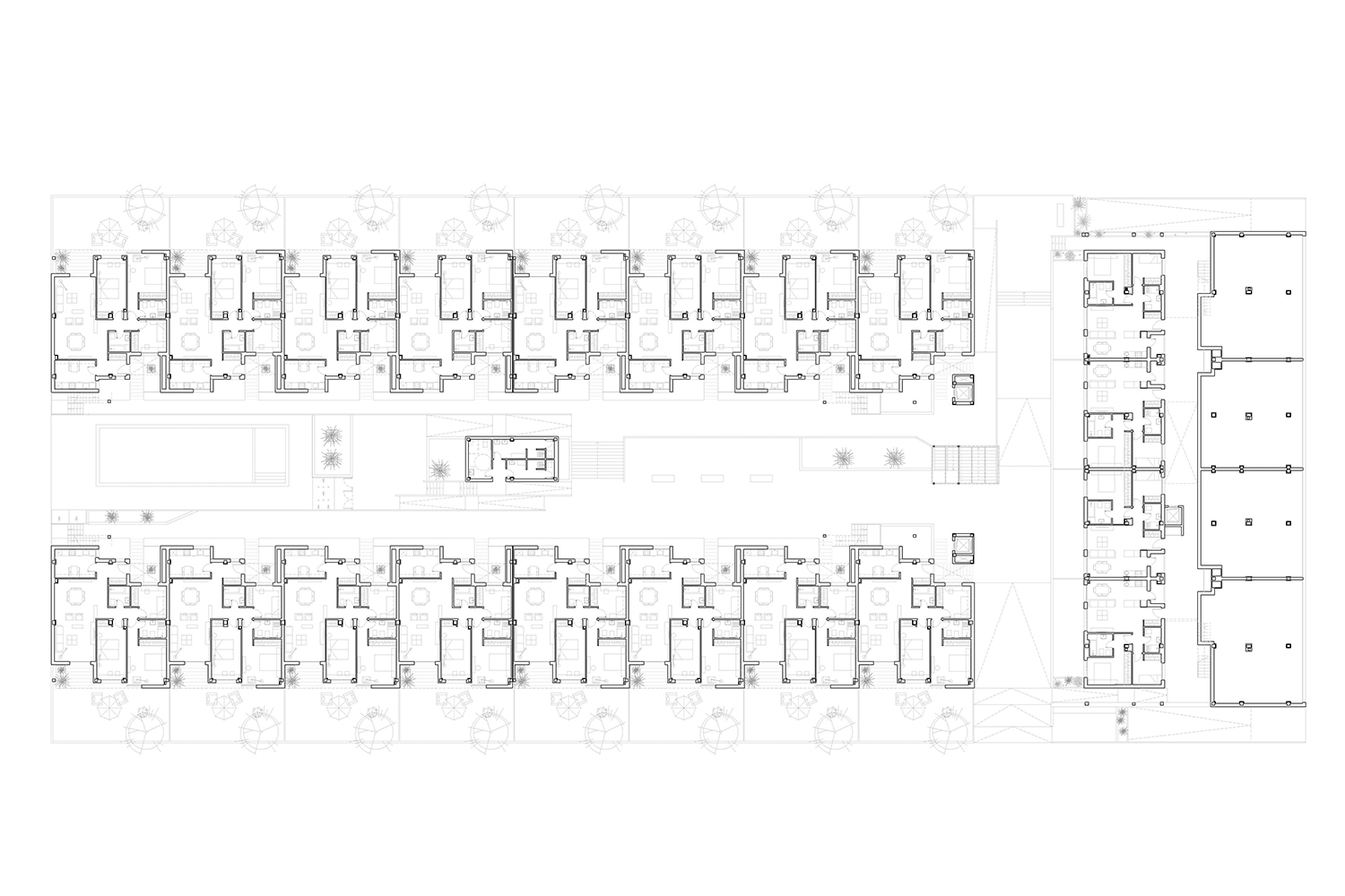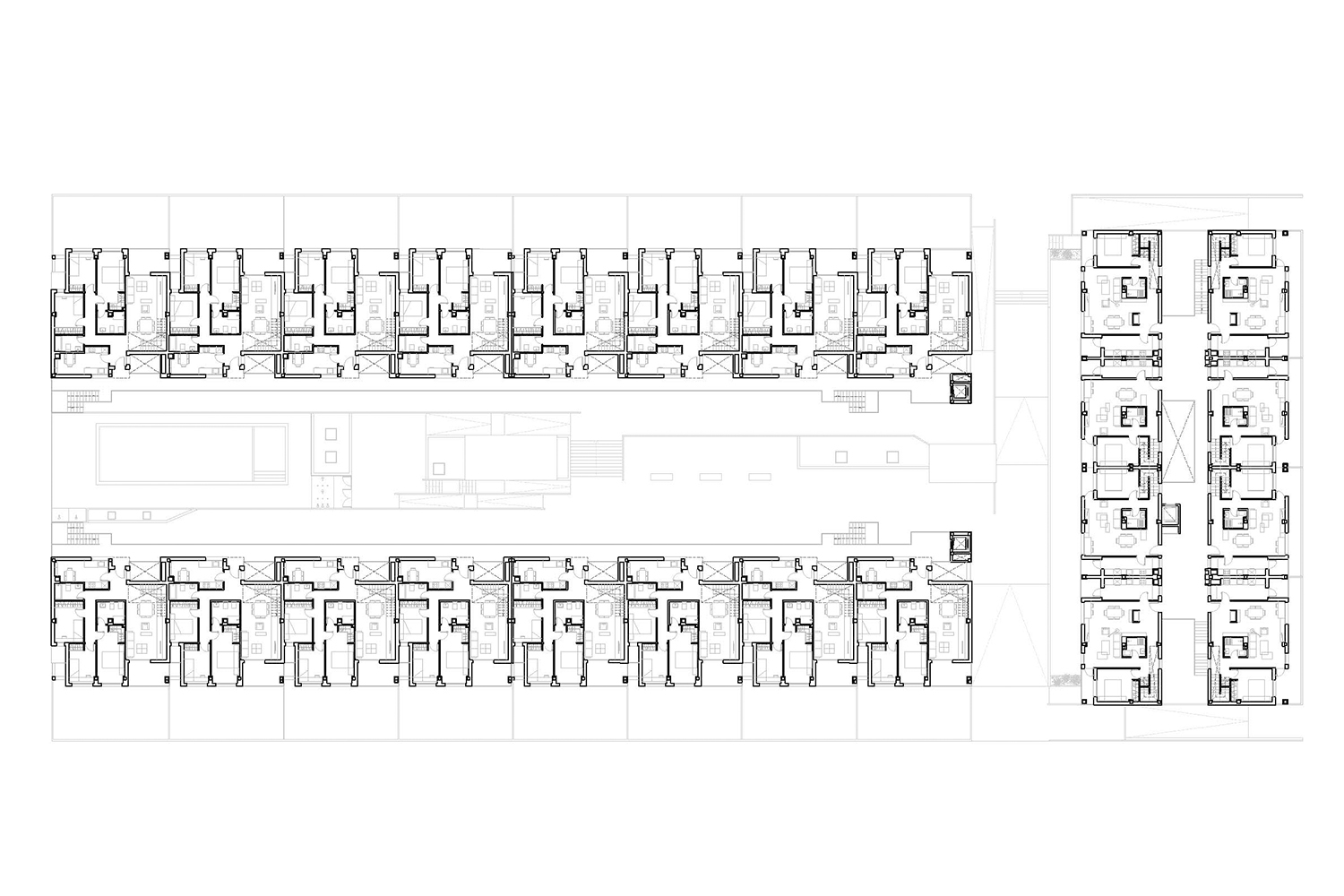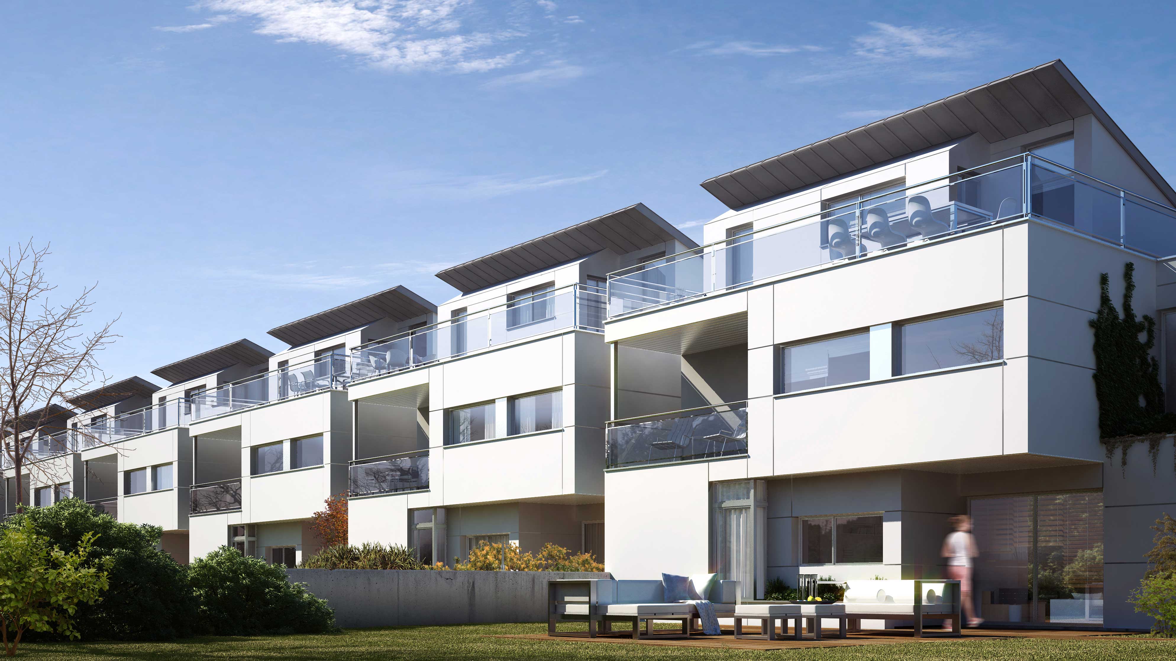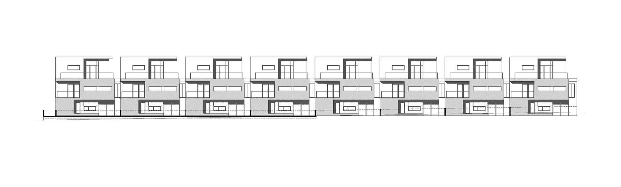 Los bloques A y B están concebidos como viviendas en galería con dos plantas más bajo cubierta. Se proyectan unas viviendas en planta baja con jardín exterior mientras que en planta primera se proyectan viviendas dúplex con terrazas en ático, es decir, trasladamos los espacios exteriores de planta baja a los áticos de las viviendas de planta superior. Exteriormente se huye de las imágenes de residencial colectivo para crear un edificio ambiguo que enlaza más con una idea de unifamiliar de baja densidad. Esta ambigüedad formal y programática buscada, viene acentuada también en la utilización de los materiales, donde las cubiertas de chapa plegada descienden por la fachada convirtiéndose en cerramiento vertical y difuminando las funciones del material.