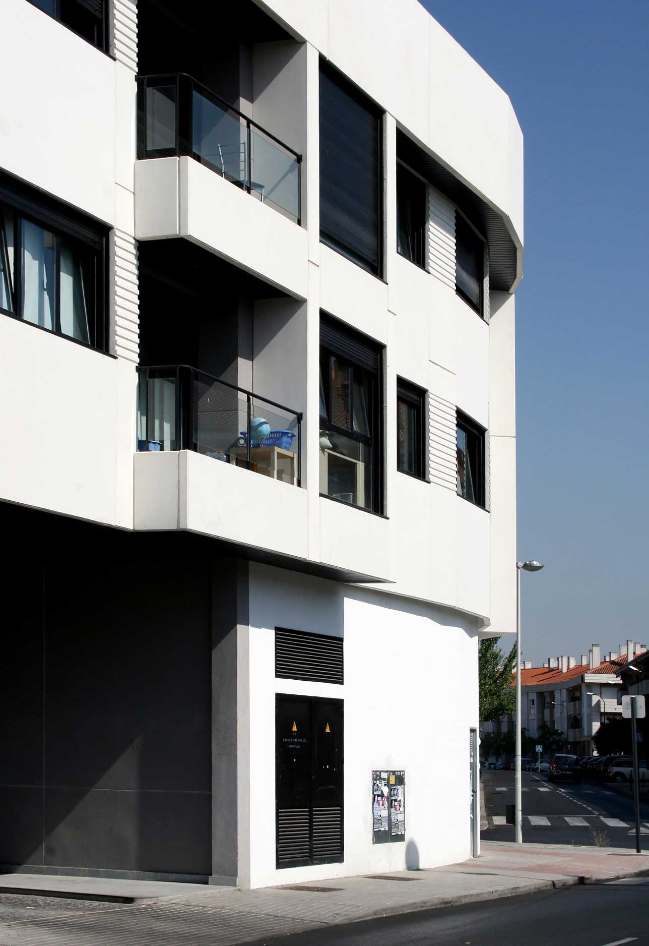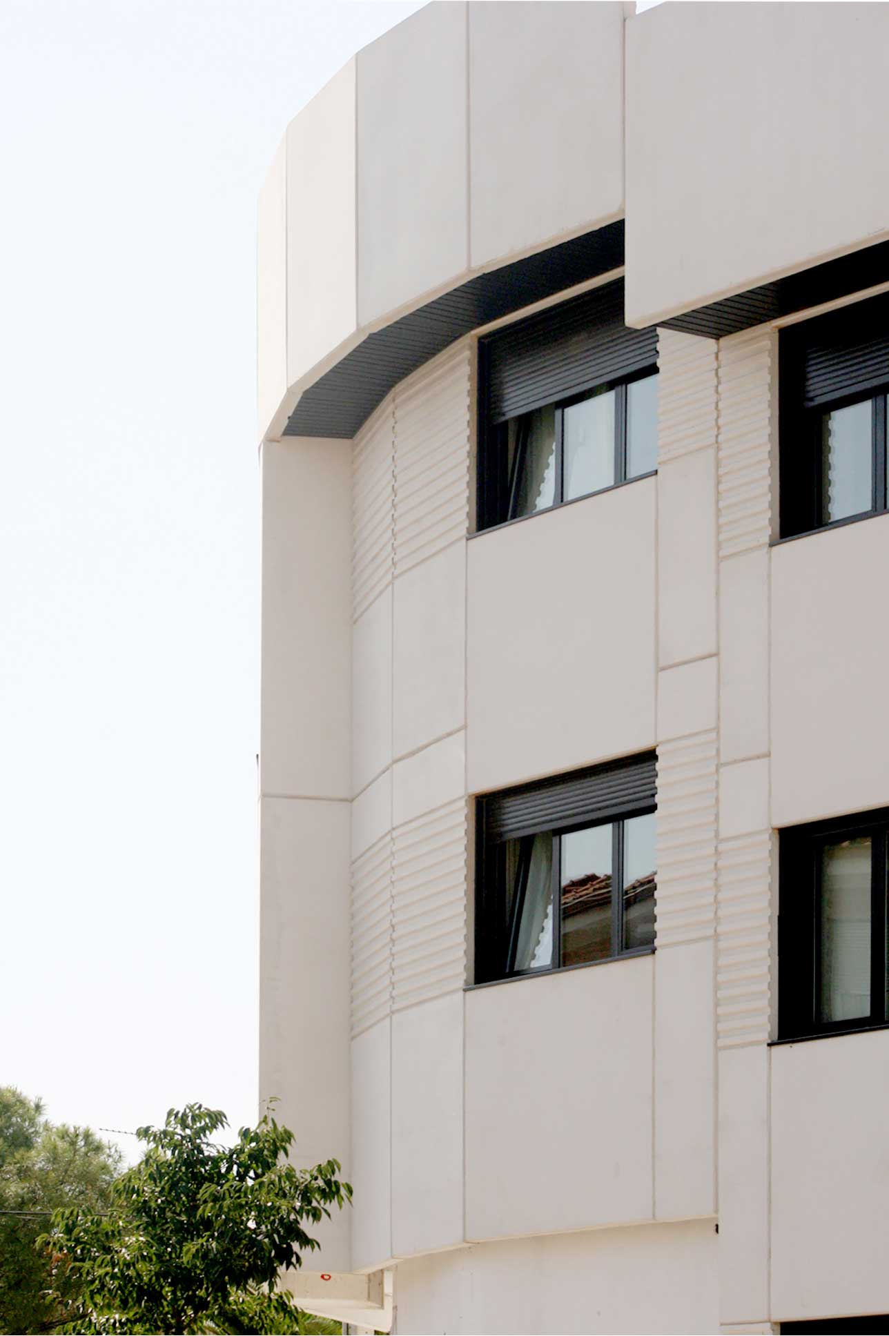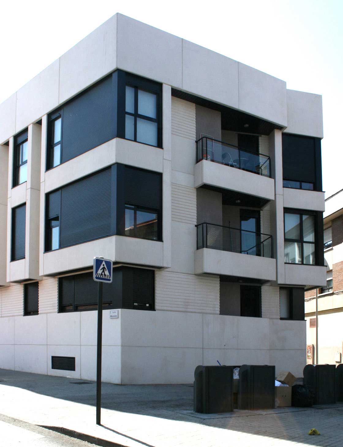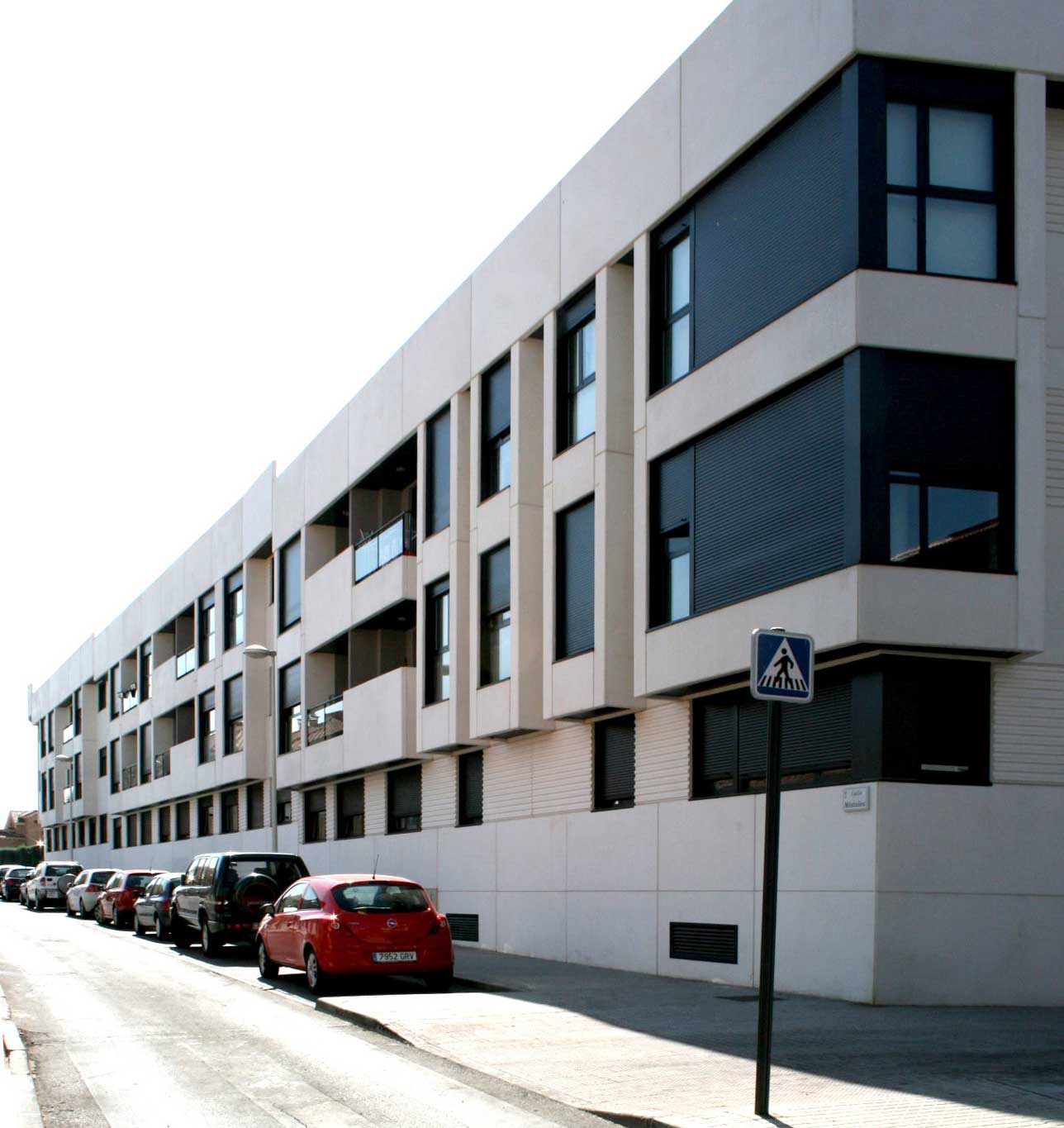 Apoyada sobre la alineación oficial en la C/ Móstoles se vuelve irregular al interior, debiendo adaptar las tipologías edificatorias planteadas a esta circunstancia absolutamente determinante en la morfología del edificio. Exteriormente viene definido por el cerramiento exterior de prefabricado de hormigón blanco, en un intento de industrial la promoción inmobiliaria optimizando plazos y recursos.