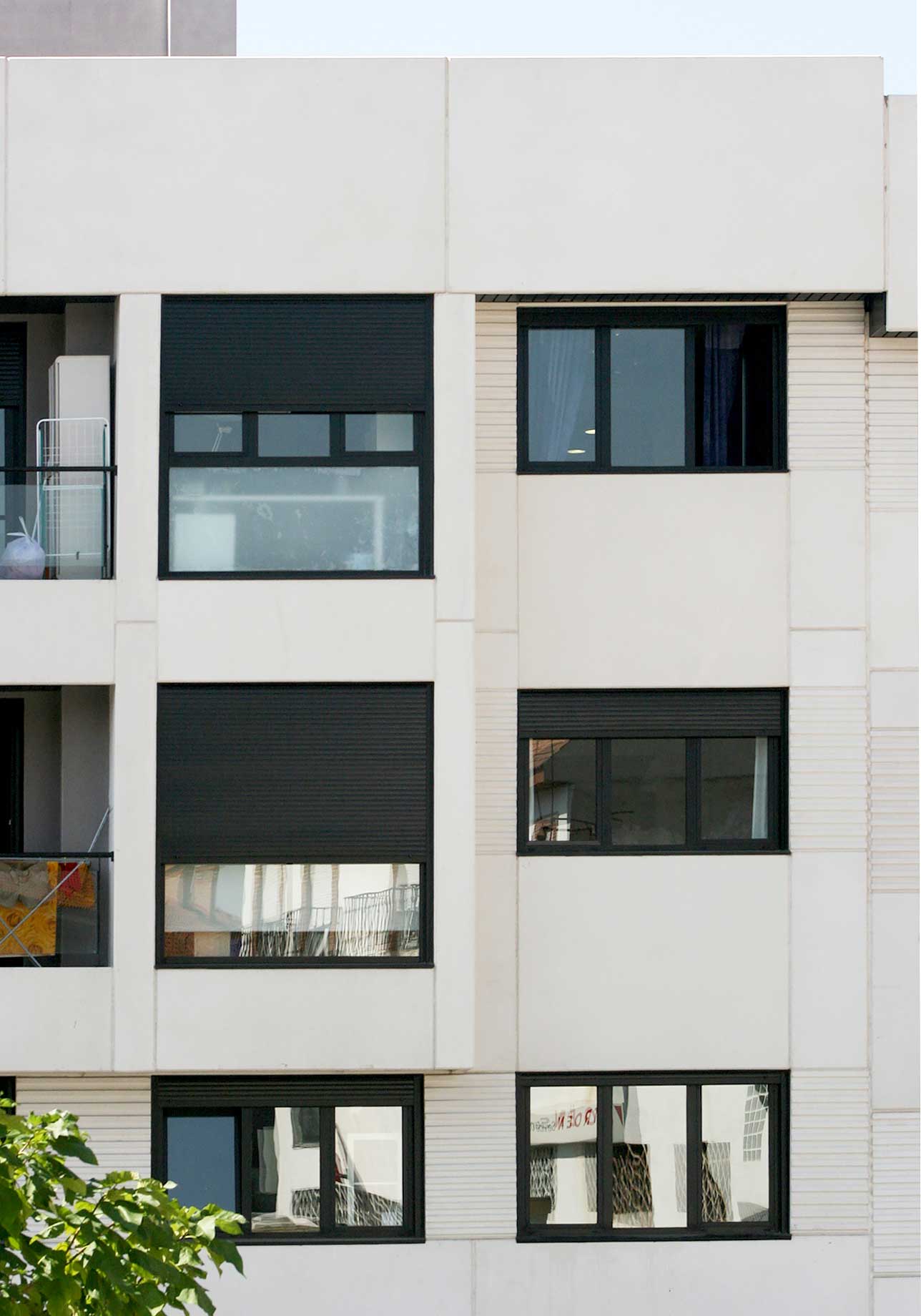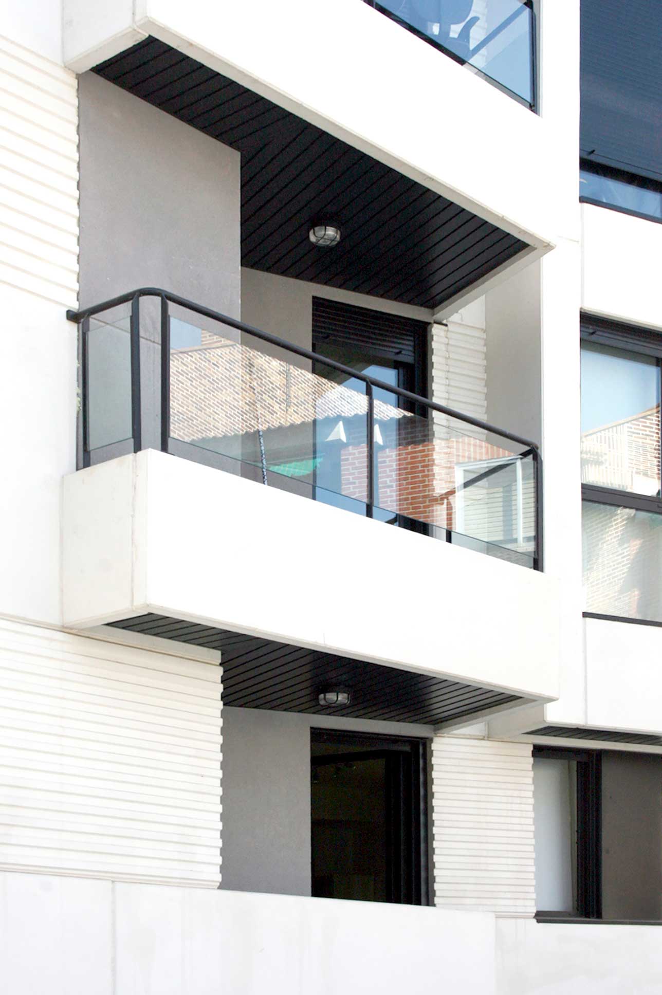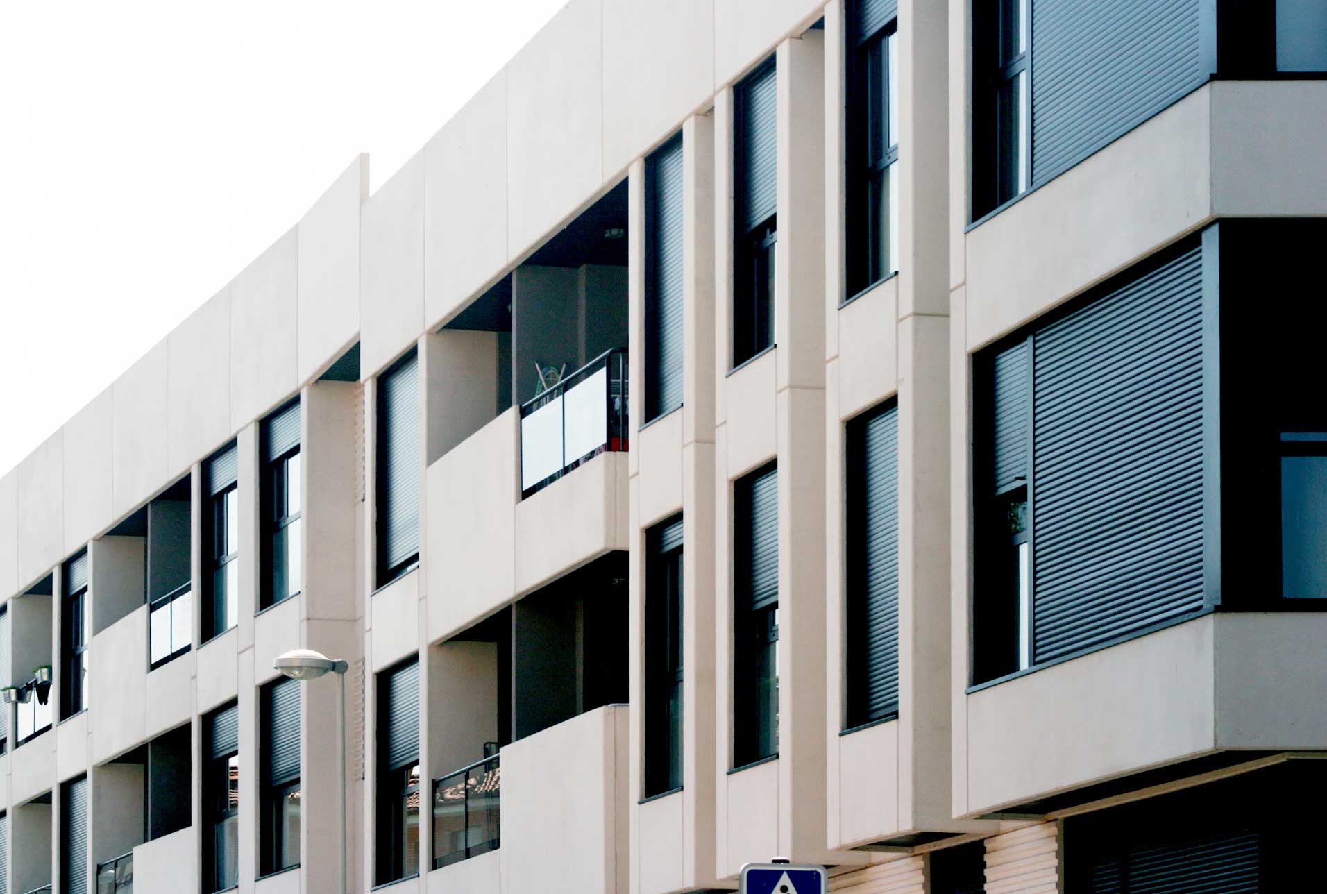 Apoyada sobre la alineación oficial en la C/ Móstoles se vuelve irregular al interior, debiendo adaptar las tipologías edificatorias planteadas a esta circunstancia absolutamente determinante en la morfología del edificio. Exteriormente viene definido por el cerramiento exterior de prefabricado de hormigón blanco, en un intento de industrial la promoción inmobiliaria optimizando plazos y recursos.