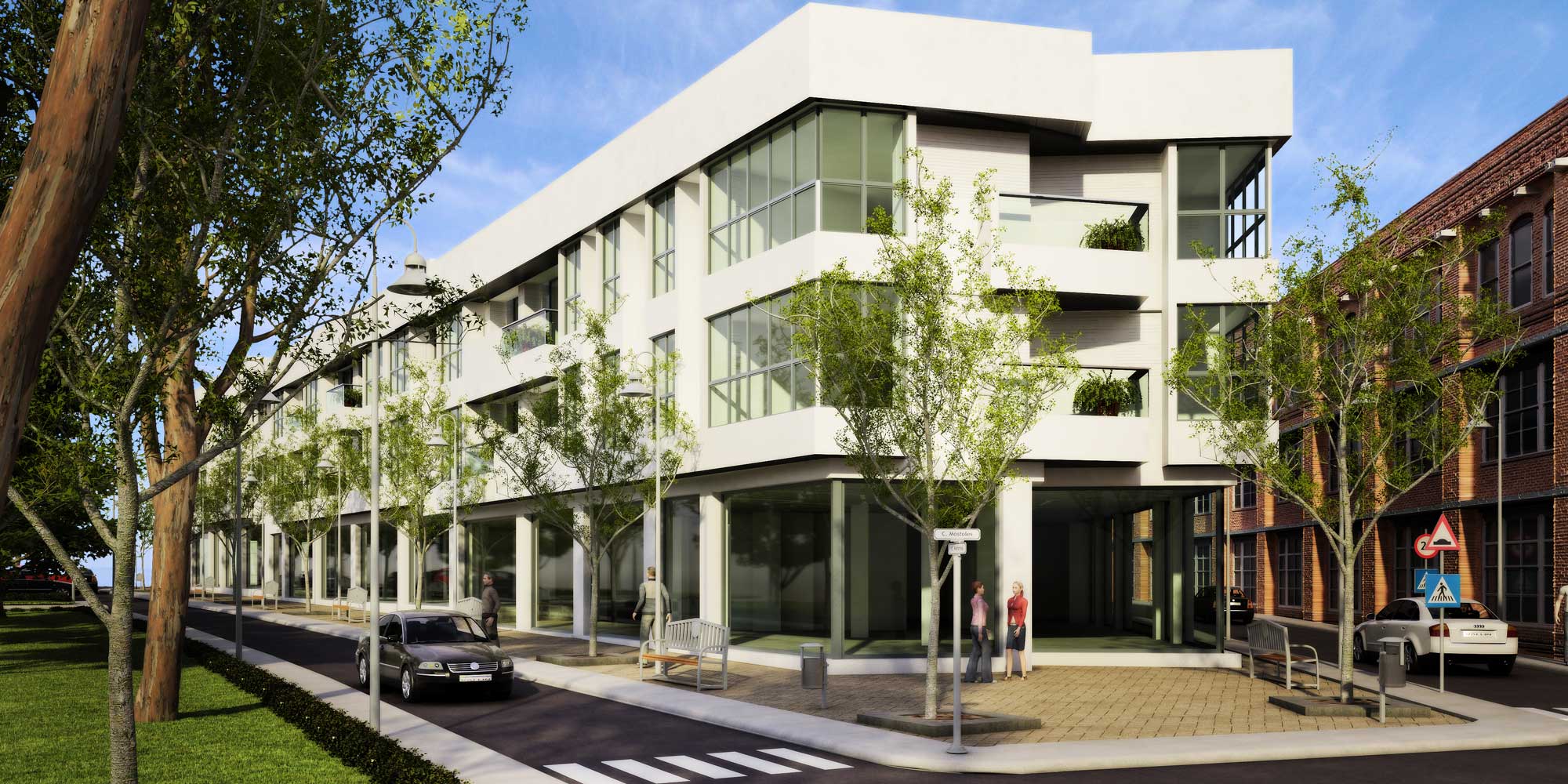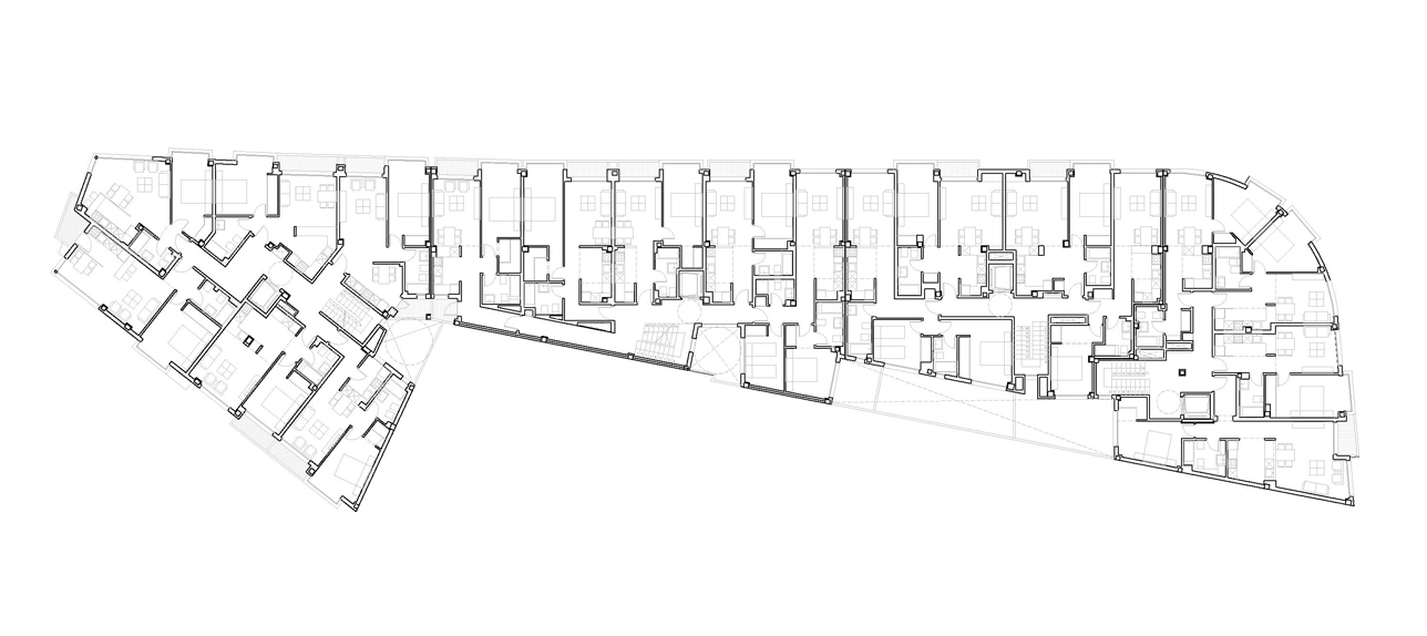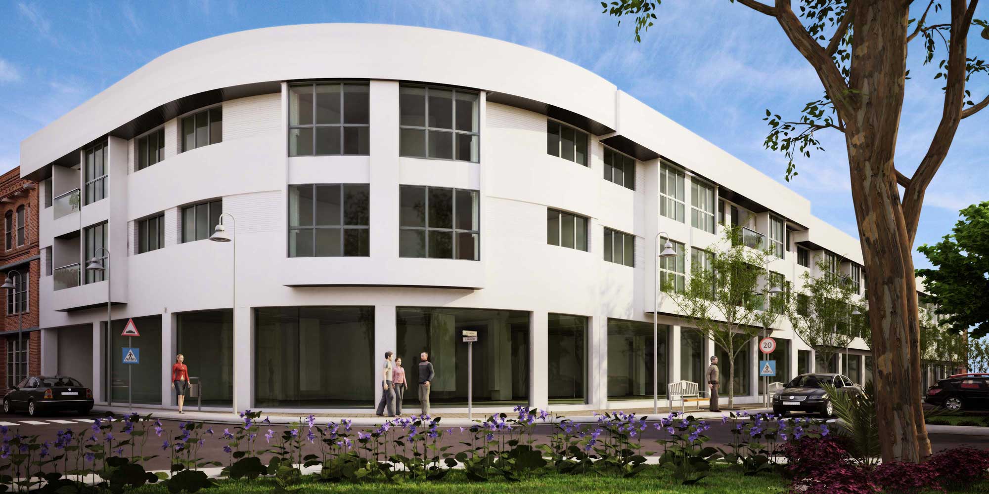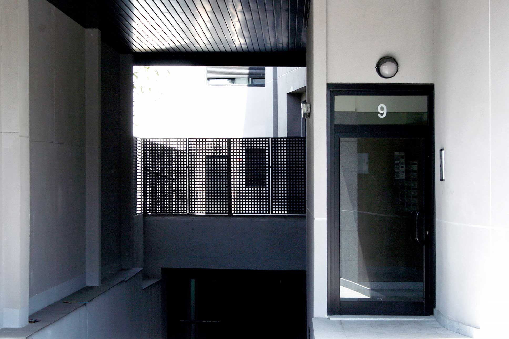 Apoyada sobre la alineación oficial en la C/ Móstoles se vuelve irregular al interior, debiendo adaptar las tipologías edificatorias planteadas a esta circunstancia absolutamente determinante en la morfología del edificio. Exteriormente viene definido por el cerramiento exterior de prefabricado de hormigón blanco, en un intento de industrial la promoción inmobiliaria optimizando plazos y recursos.