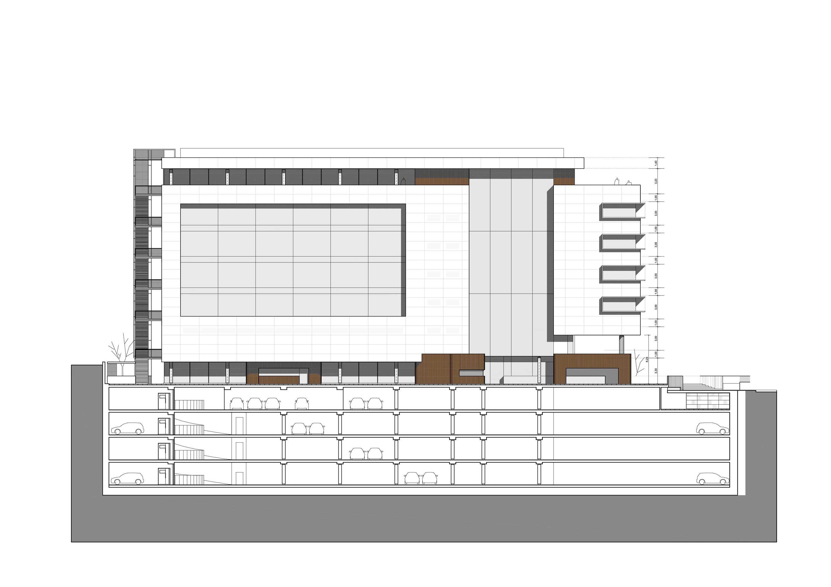 El edificio propuesto observa el CONTEXTO, lo estudia y asimila, respeta y finalmente en diálogo continuo lo potencia. Las premisas y antecedentes son claros. Un solar de planta longitudinal asociado a una “sombra alargada” que es el edificio de José Antonio Corrales y Ramón Vázquez Molezún, y un programa de necesidades claro y conciso. De este modo, nuestra propuesta se presenta como dos envolventes, dos volúmenes desplazados en la misma dimensión longitudinal del solar, y que vienen determinados por su relación con los espacios y volumetrías edificatorias del entorno.