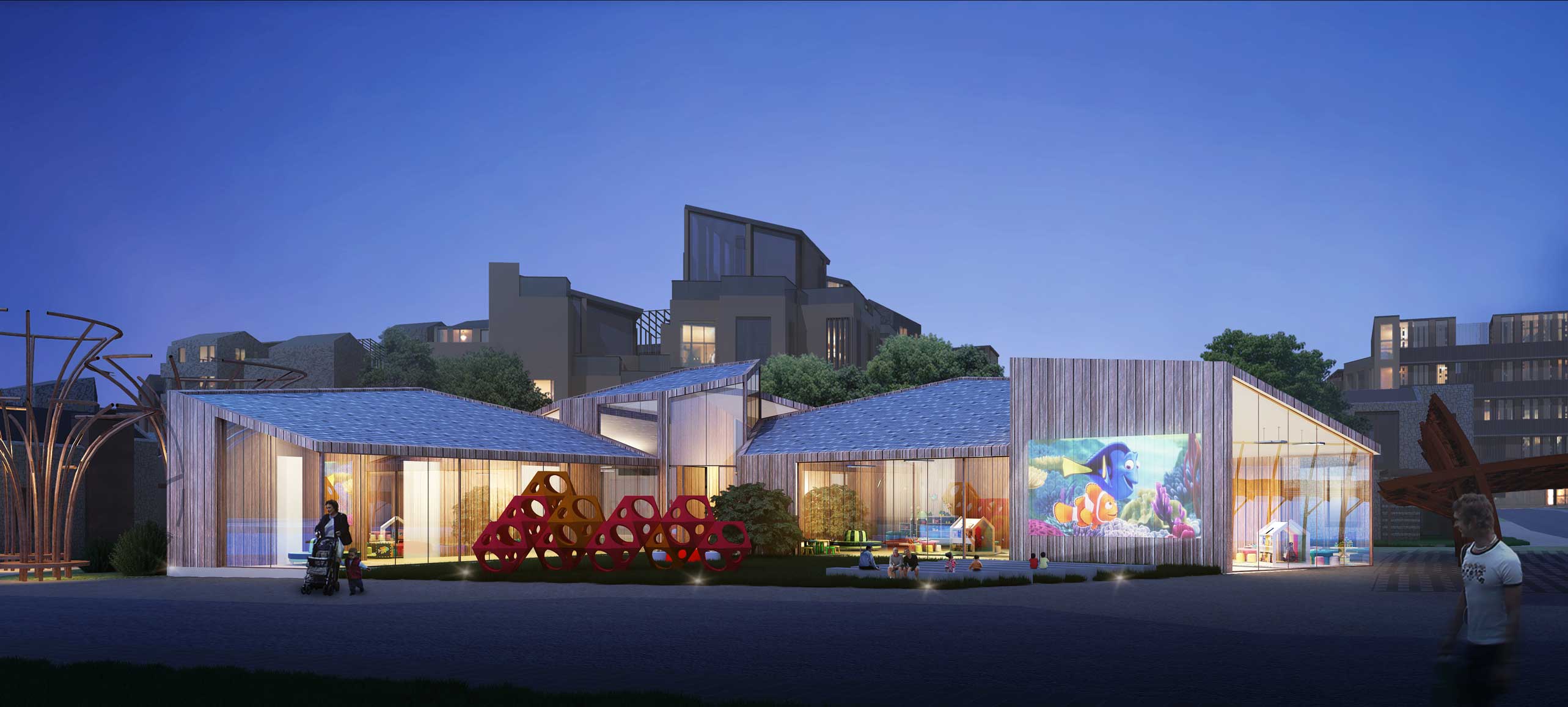 Un origami que queda recortado, papiroflexia. Una respuesta sutil a un programa de necesidades destinado a los más pequeños. Volúmenes independientes que han sido recortados por nuestra tijera y crecen y se articulan de manera independiente. Pliegues que provocan espacios y absorben la luz.